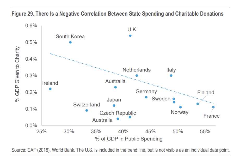 Εξαιτίας αυτού, οι κρατικές δαπάνες τείνουν να εκτοπίζουν τις ιδιωτικές δαπάνες και επενδύσεις. Οι οικονομολόγοι ονομάζουν αυτό το φαινόμενο crowding out. Η άνοδος του κράτους πρόνοιας, για παράδειγμα, έχει εκτοπίσει την ιδιωτική φιλανθρωπία. Μια έκθεση της Citigroup αναφέρει: "Σε χώρες με υψηλότερες δημόσιες δαπάνες, υπάρχει η αίσθηση ότι οποιοδήποτε χρέος προς την κοινωνία έχει εξοφληθεί μέσω του φορολογικού λογαριασμού ενός ατόμου ή μιας εταιρείας. Όπου υπάρχουν λιγότερες δημόσιες δαπάνες, υπάρχει μεγαλύτερη αίσθηση ότι κάτι χρωστάμε. Αυτή η διάκριση οδηγεί την τάση στο διάγραμμα 29".
